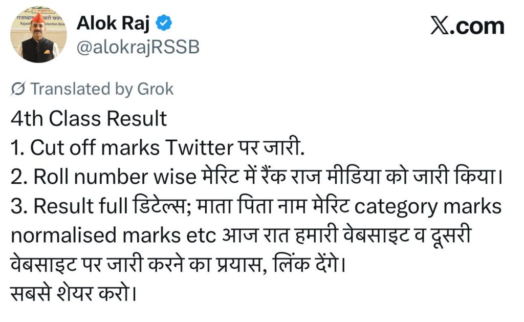 Rajasthan Fourth Class Employee Final Result 2026 को 16 जनवरी 2026 को जारी किया जा रहा है। यह जानकारी बोर्ड अध्यक्ष द्वारा साझा की गई है।