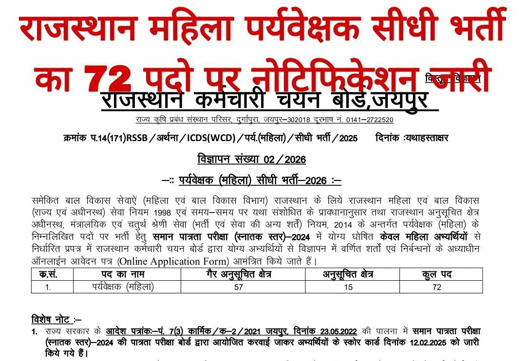 | Rajasthan Female Supervisor Bharti 2026 Online Form End | 5 Febuary 2026 |